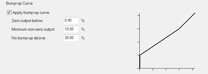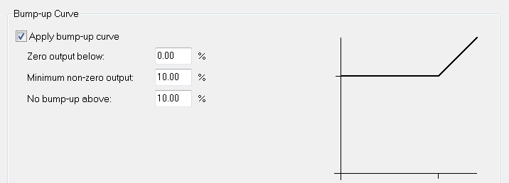 A bump-up curve which gives zero output below 0.4%, a minimum non-zero output of 10% and is linear from 30% is defined thus: