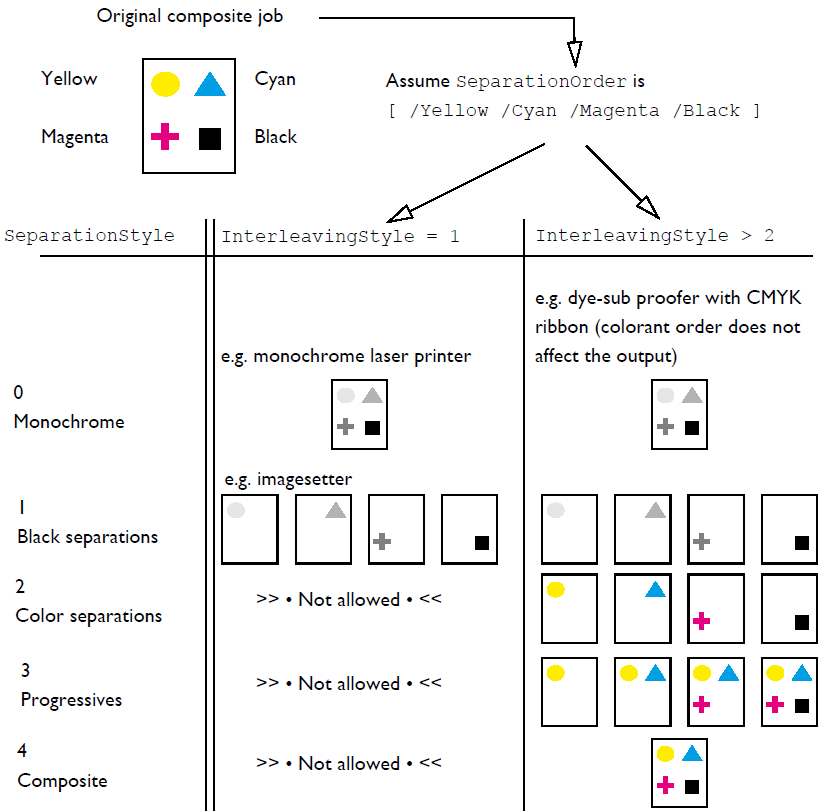 This figure shows the effects of SeparationStyle in SeparationDetails and InterleavingStyle in the page device when used to control the output of a composite job to common output devices