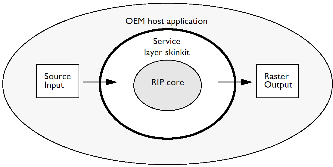 The Harlequin Core SDK allows you to create an application that handles the input of job data and produce output rasters; see the following figure. In addition, because the source code for the service layer skinkit is provided, you can enable other functions and features of the Harlequin Core SDK.