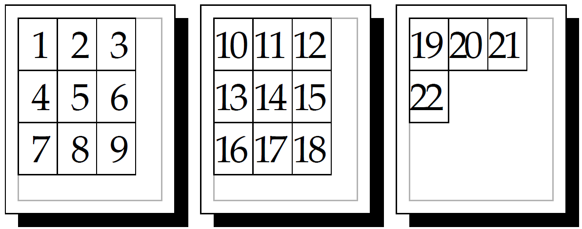 The EndPage procedure does most of the hard work here. In the normal case, it increments the offset in x by the width of each input page until it would go off the right hand edge, at which point it resets to the left margin and increments in the y direction. When the page goes off the top (or actually off the bottom, since BeginPage is inverting it), we reset to the origin and print the page by returning true.