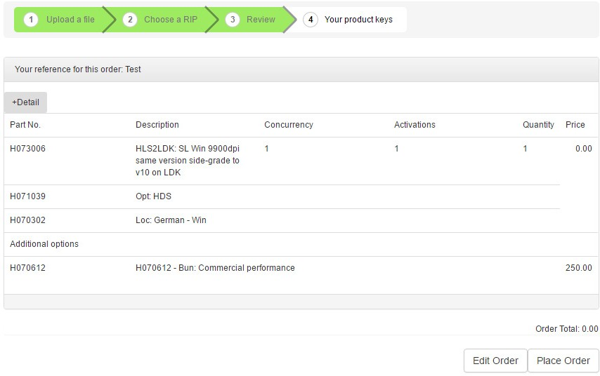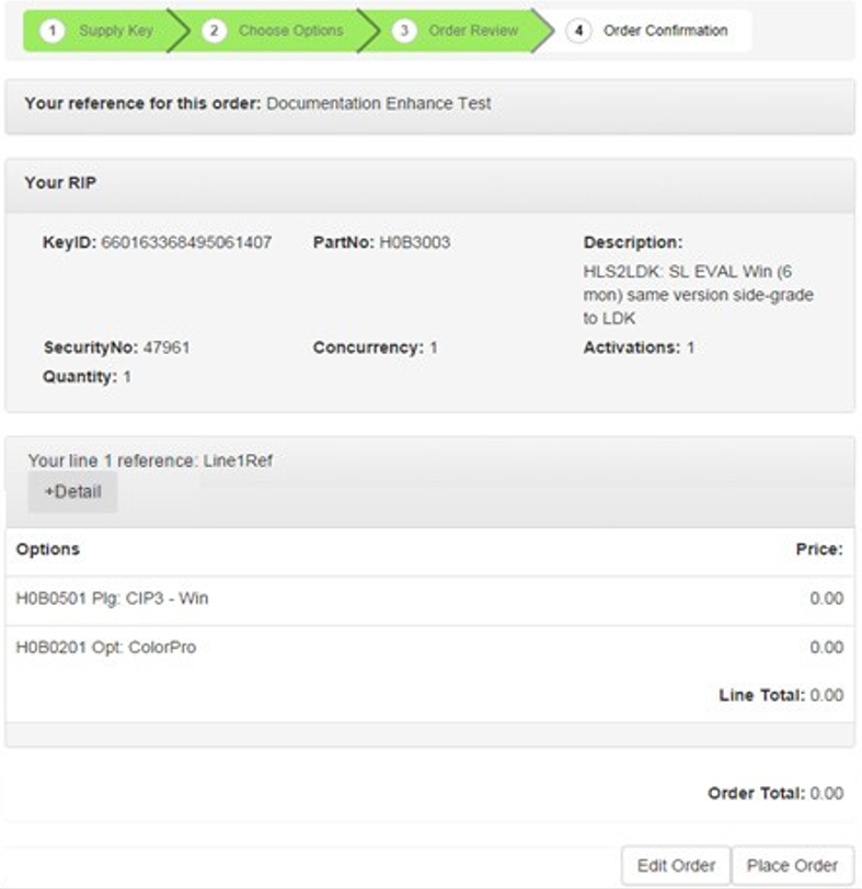 Use the Edit Order button to amend the order; click Place Order to submit your order which will complete by displaying the Order Confirmation page. Your Product Key or keys will be displayed; a link to the CSV file which also contains details of your order is included. A copy of the CSV file is also e-mailed to you. Note: After you generate a key, activate it. !worddavdb2b8587ea1e0148f67bfa9ac2460484.png|height=340,width=449!Figure 6.6 The Order Confirmation page with fulfilment details