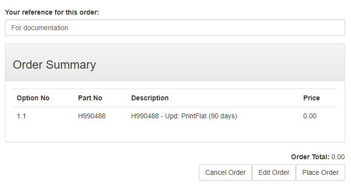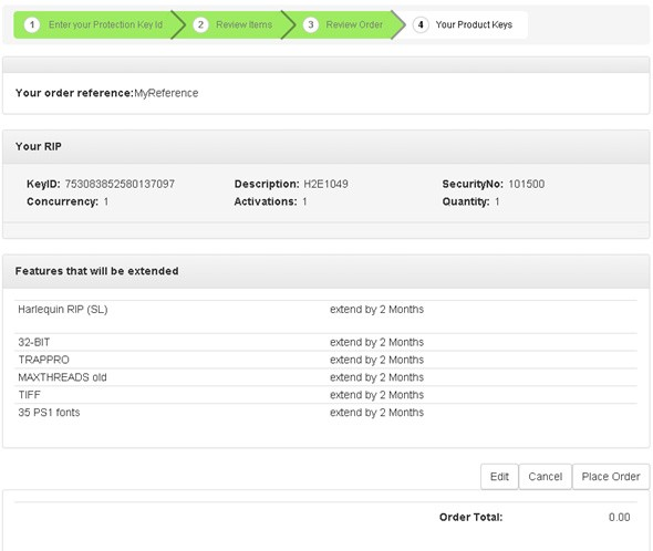If you want to change the extension period, click the Edit button to return to the previous page. Selecting Cancel will return you to the start. Click the Place Order button to submit your order and generate the extension for your existing time limited license.