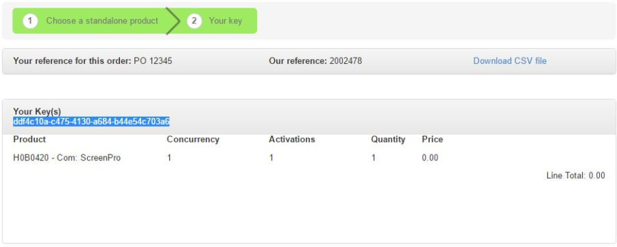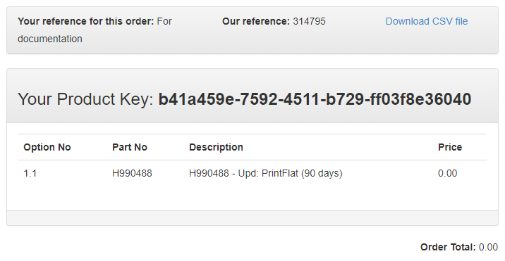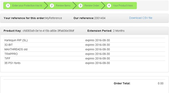 Your Product Key and order number is displayed along with details of your new expiry date. A CSV file containing your Product Key and the order details can be downloaded from the page using the Download CSV file link.
