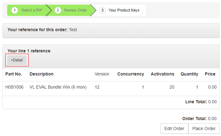 Click the +Detail button to display more information about the products you've chosen. This is particularly useful if you've selected a bundle as the +Detail button will expand the bundle into individual part numbers. Click -Detail to hide the additional information.
