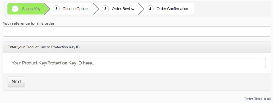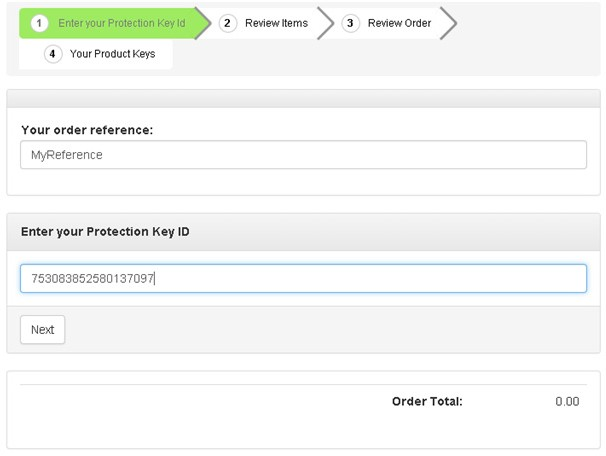Note: This option is only available to those persons authorized to place orders. You will need a Protection Key ID to use this feature. To continue enter a reference for this order and your Protection Key ID, and then click Next.