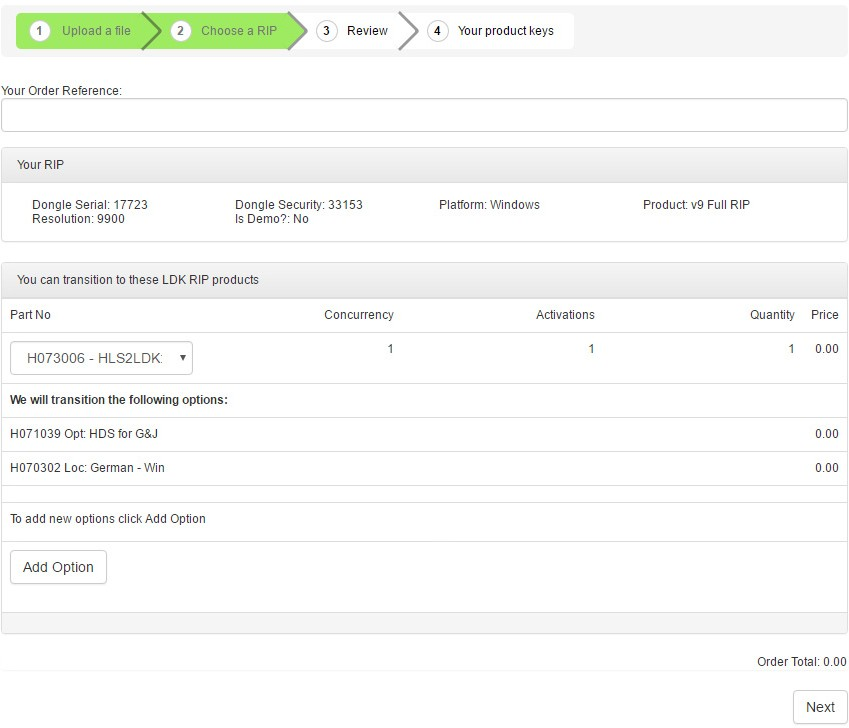 You can add options to your new LDK license as you transition. In the following picture we've uploaded a .superpro file and used the Add Option button to choose a new bundle.