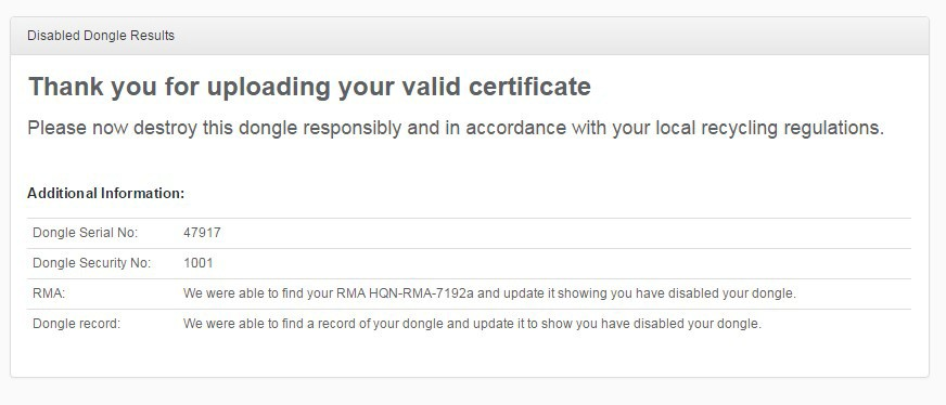 This completes the process. Note: If GGSL is not aware of the dongle or if the certificate is not valid, you will be notified after the file is uploaded. If the dongle has already been marked as destroyed, the ordering system will respond with: