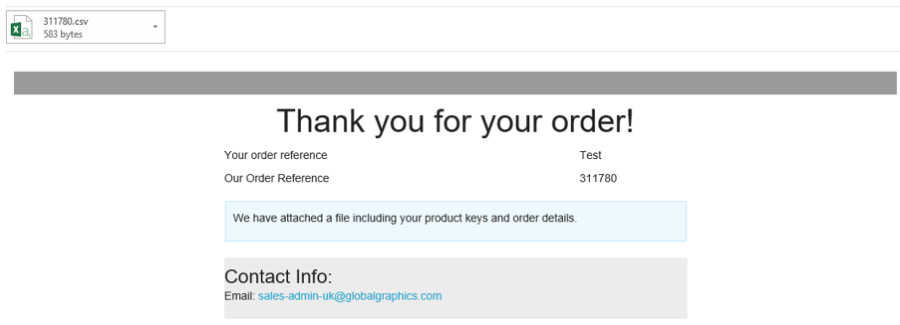 This page provides you with details of the Product Key for each item in your order, a summary of what you ordered and a link to a CSV file containing details of the order. You will also receive a copy of this file by e-mail. If you would like copies of this e- mail sent to other addresses (such as a group), please inform GGSL.