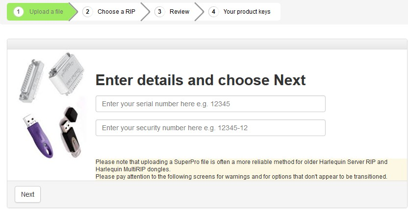 If you are moving a Harlequin Server RIP or MultiRIP from HLS to LDK, GGSL recommends that you use the GetDongleInfo tool, which is available when you install a new RIP. (See <installation folder>\ldk\getdongleinfo.exe.) Use GetDongleInfo to generate a .superpro file and then upload the file to us. See "Upload .superpro file walkthrough" below.