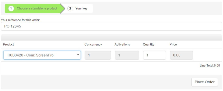 Note: Concurrency and activations are normally fixed values for ScreenPro and SetGold; these values are not user editable. Figure 8.3 The completed order form When you are ready to place your order click the Place Order button. The order will be processed and one or more Product Keys generated. Your order number, product key and link for a CSV (Comma-separated Values) file summary of your order will be displayed. You will also receive an e-mail with details of your order including a CSV file with your Product Key(s). Figure 8.4 Summary for your order