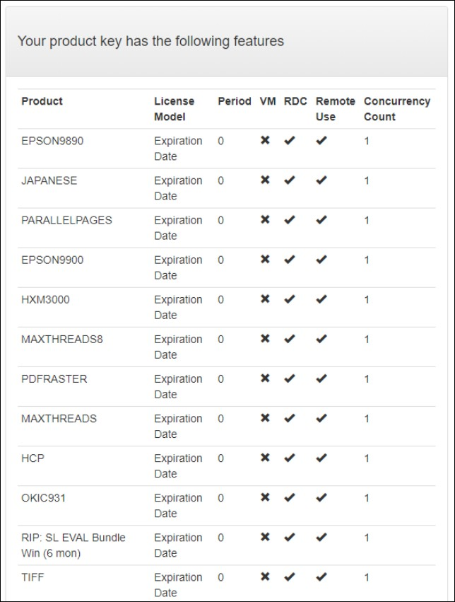 Your Protection Key details are retrieved from the licensing server along with the details of the RIP and its related products: