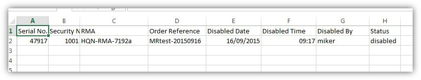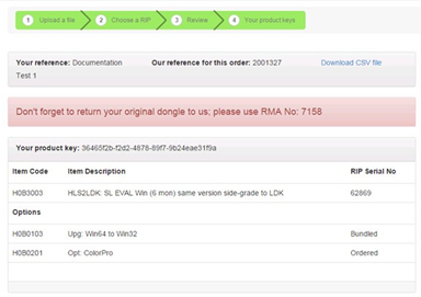 Your order is processed and your Product Key(s) and the RMA number for your Dongle return is displayed. A CSV file containing the order details can be downloaded from this page using the Download CSV file option, and a copy is e-mailed to you.