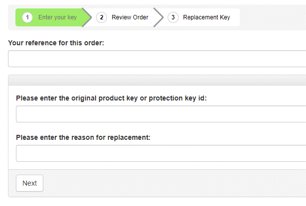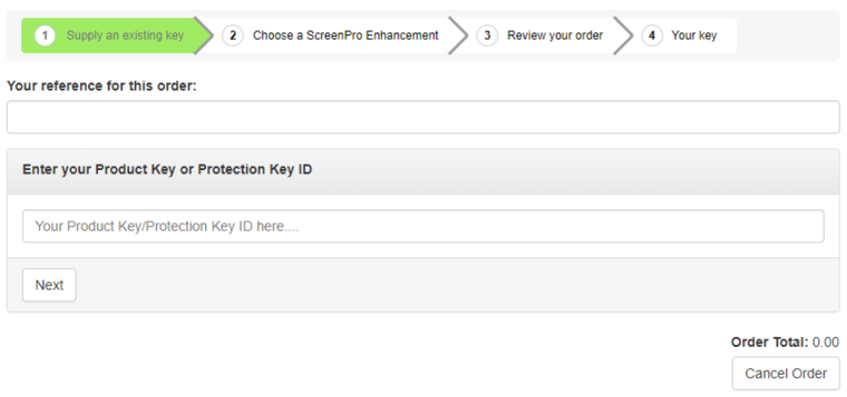 You will need your ScreenPro Product Key or your Protection Key ID and an order reference. In the following image a customer has supplied a Protection Key ID and clicked Next.