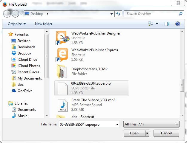 Click the Select File button to open a File Explorer window, then navigate to your .superpro file: