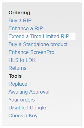 If you have purchased a time limited-RIP it may be possible to use the Extend a Time Limited RIP option to extend the duration of its license. Not all Time Limited licenses can be extended in this way; currently a limited number of RIPs designed for leasing have been made available. If you follow this process, the LDK Ordering System will inform you if your RIP can be extended or not; alternatively, refer to your contract.