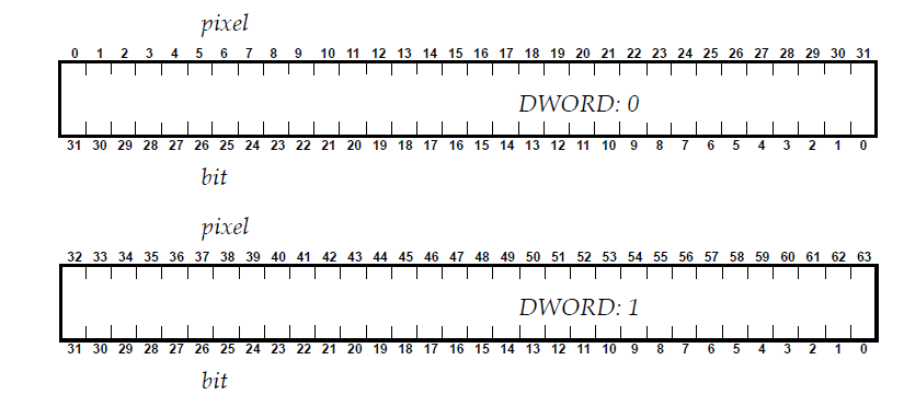 In a 32‐bit RIP each 32‐bit machine‐word (DWORD) in the raster has 32 bits of data, arranged with the left‐most raster bit/pixel at the most significant end of the DWORD (bit 31) and the right‐most raster bit/pixel at the least significant bit of the DWORD (bit 0), like this:
