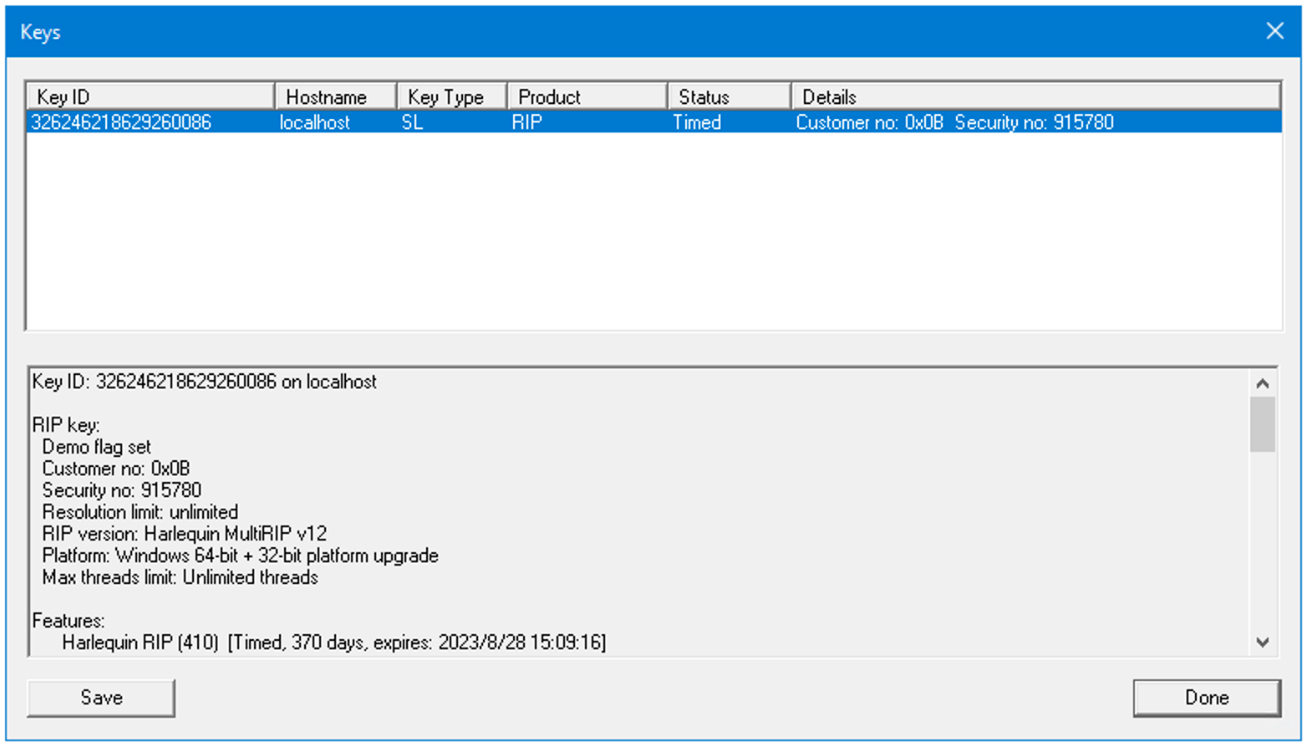 The various products and features by name and number are listed along with the location of the Sentinel key and other information. The Sessions column displays the number of instances of the RIP and other layered features that currently have claimed licenses. The location value is the “Local”, IP address, or machine name in the case of a remote Sentinel License Manager (see Can I run multiple RIPs from a single license?).