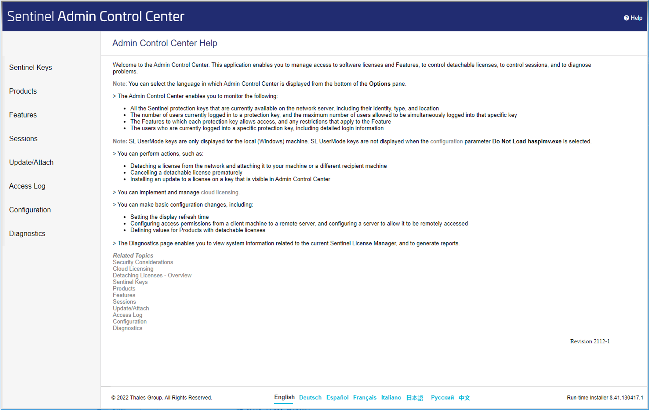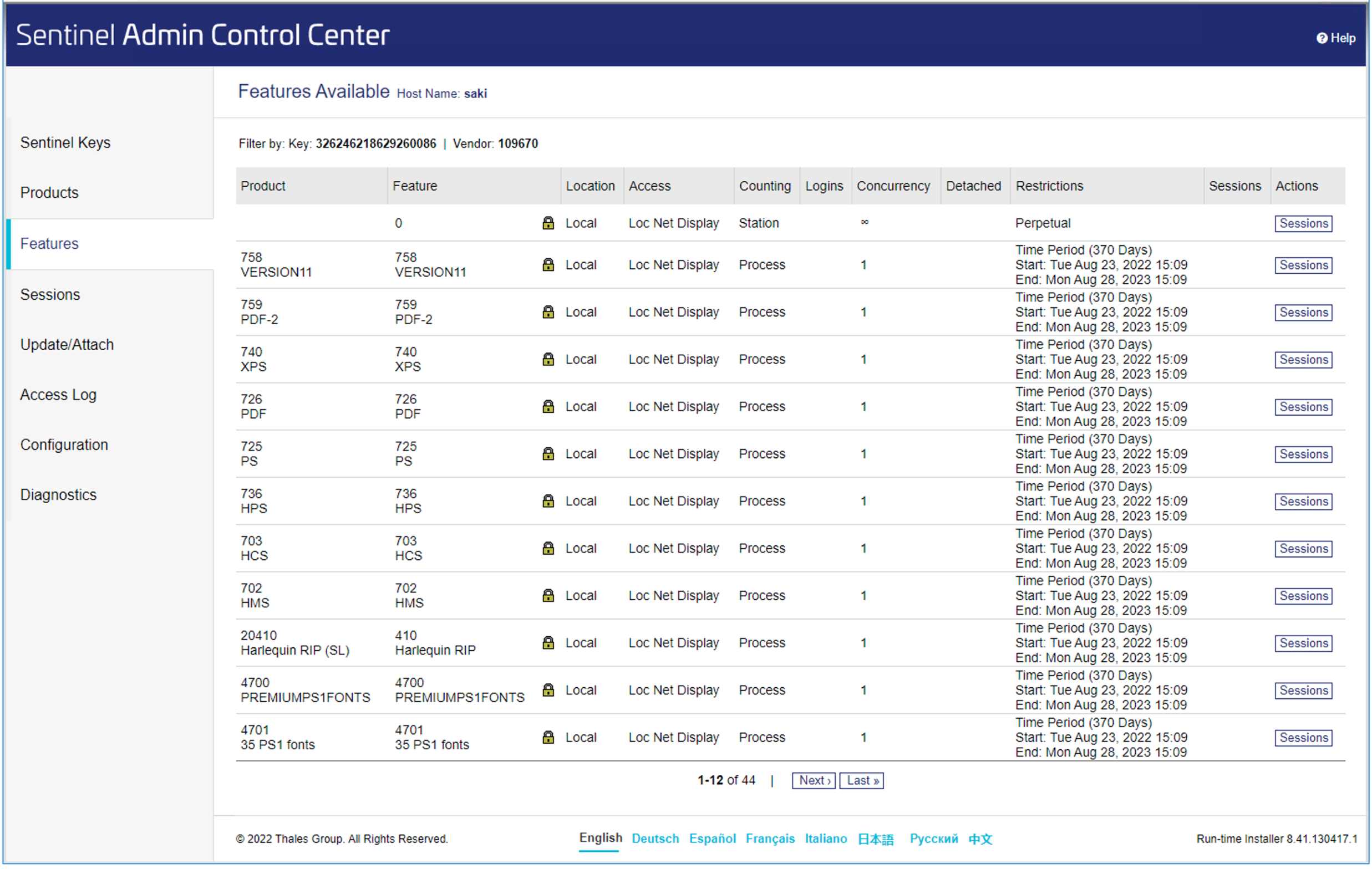 When the Sentinel LDK runtime environment is installed you can also view the Admin Control Center (ACC), which displays the Protection Key IDs as seen by Thales components. It displays the same Global Graphics keys as the LDK Tool, but does not display the full details of the RIP license. It can show additional details that may be useful for diagnosing licensing problems.