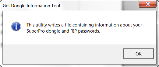 Click OK once more and a message displaying the location of the .superpro file is dis‐ played. The .superpro file is generally written to the same location as the getdongleinfo.ps file.