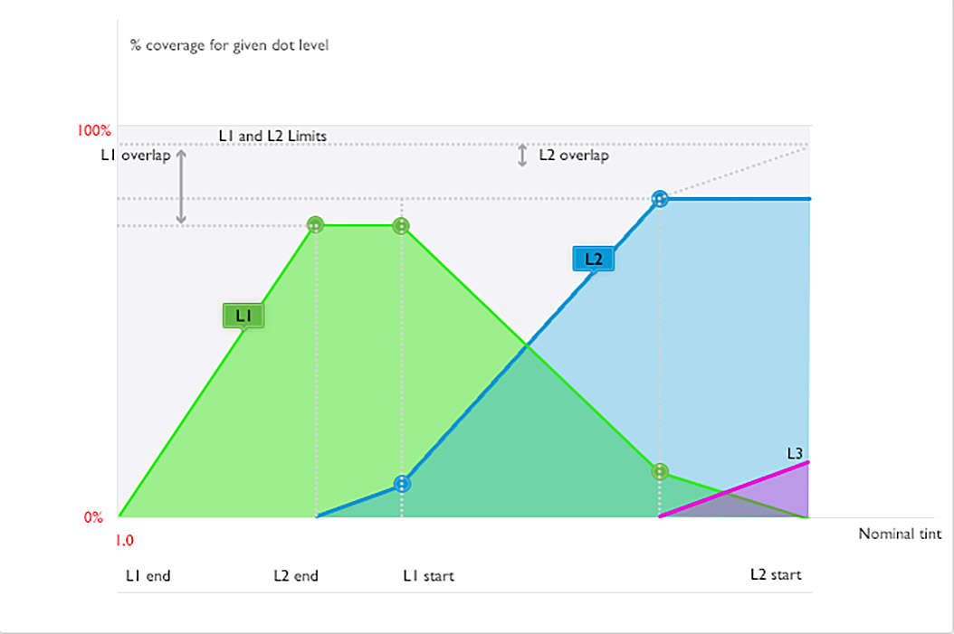 Note that while calibration can stretch and compress the color ranges to compensate for slight variations in the density gradient of the mixed screen, it cannot change the proportions of the two screens in an overlap. Therefore, choosing the rates of the two functions in the overlap is critical to achieving a smooth mix.