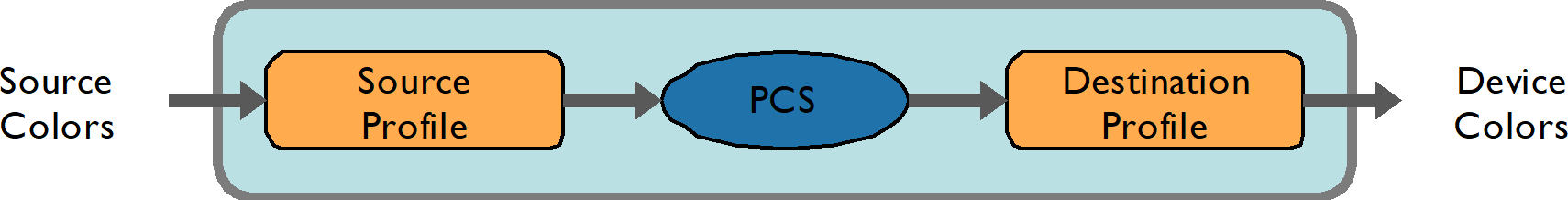 ICC color management is a simple concept. One can model an input device and an output device using ICC profiles. The resulting source and destination profiles are connected using a Profile Connection Space (PCS) to create a standard ICC transform using the two profiles as illustrated. The transform converts colors between the input and output spaces and causes colors on the output device to appear much the same as they do on the input device. There are many details involved in doing ICC color management well, but most of the details fall on the profile producer, while the Harlequin RIP is a profile consumer with a relatively mechanical job of converting colors according to the recipes in the profiles.