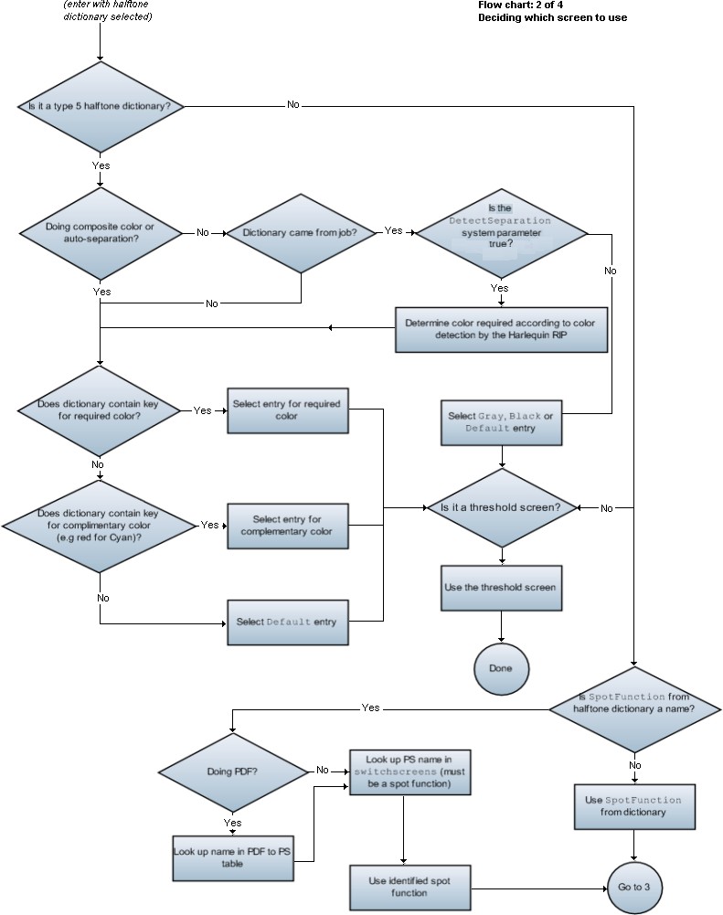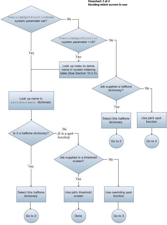 In either case, the spot function supplied with the job (or the screen as a whole) can be overridden in various ways, usually starting with the OverrideSpotFunctionName system parameter. This is illustrated in the flow charts, and each key’s effect is described in more detail in the table of Override screening parameters.