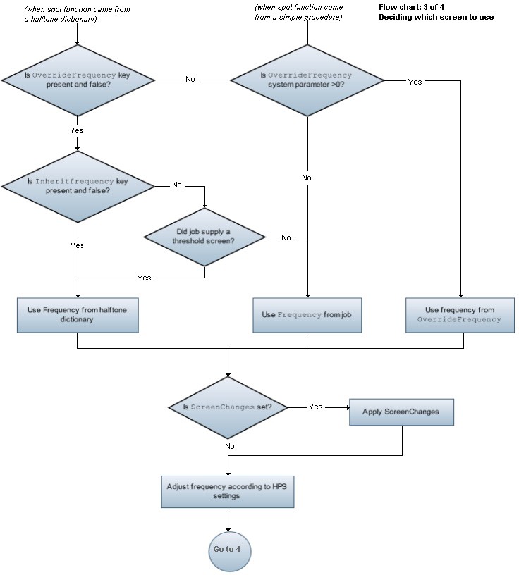 Frequency is determined from what is set by the job, or from the OverrideFrequency system parameter if set, or from a halftone dictionary located using OverrideSpotFunctionName, according to the rules shown in the flow charts.