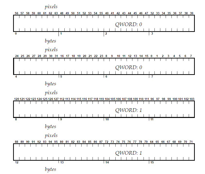 In a 64‐bit RIP each 64‐bit machine‐word (QWORD) in the raster has 64 bits of data, arranged with the left‐most raster bit/pixel at the most significant end of the QWORD (bit 63) and the right‐most raster bit/pixel at the least significant bit of the QWORD (bit 0), like this: