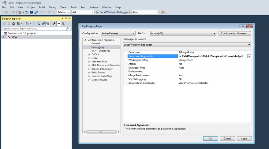 - In the clrip property pages dialog, click either Debug or Release in the Configuration selection box, (depending on which version of the HHR RIP you built).