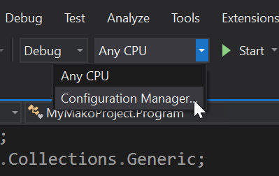 To add x64 and remove the default AnyCPU configuration, follow these steps: