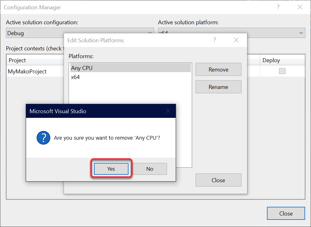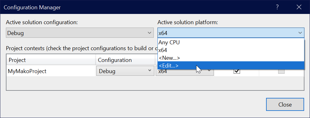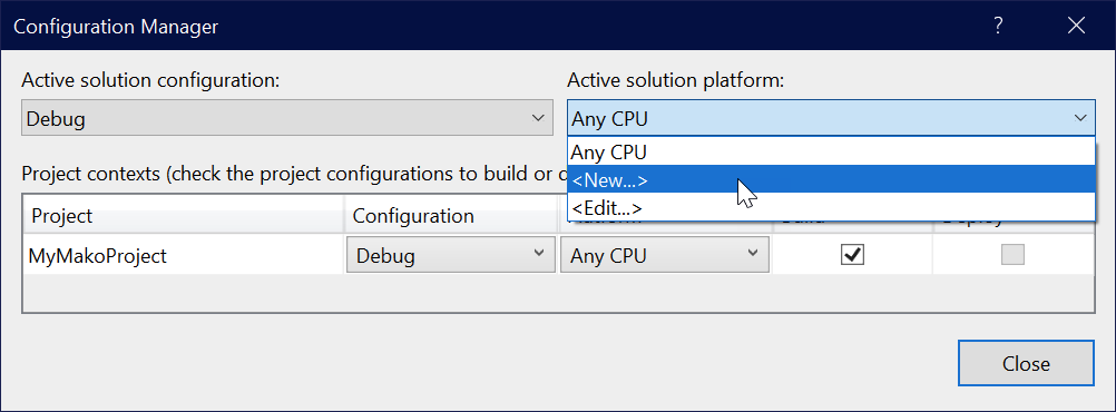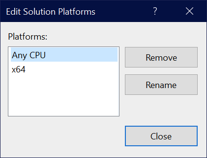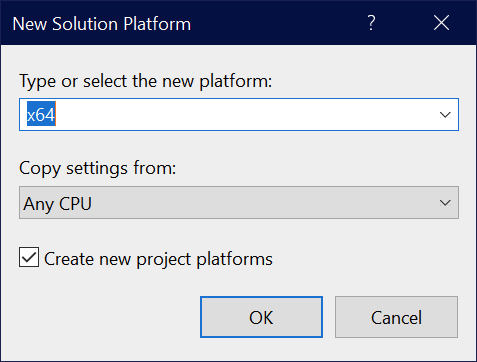 3. Choose x64 for the new platform and click OK. At this point you are good to go. You will notice that your project has been switched to x64. However, to avoid any confusion you can remove the AnyCPU platform from your configuration with the next three steps. |