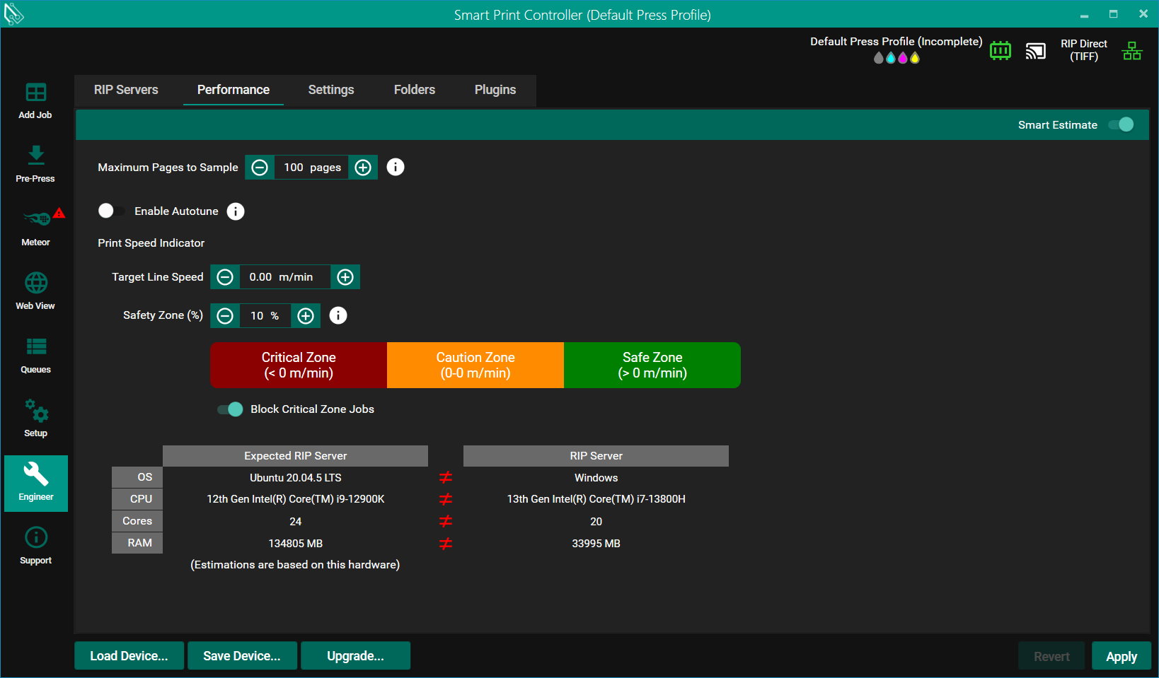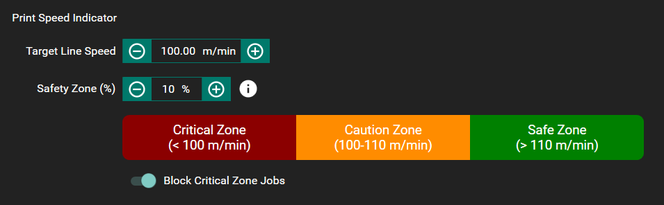 - Block Critical Zone Jobs will forbid any job with a Red speed indicator from entering the Print Queue when enabled. This option is enabled by default.