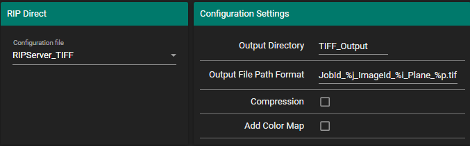 - Output Directory specifies a subfolder within the shared RIP Server folder for the TIFF files to be written.