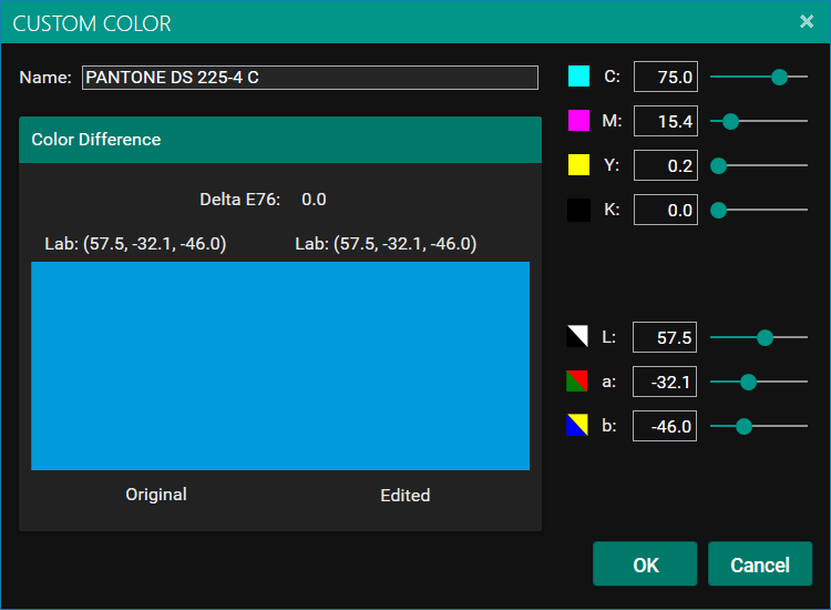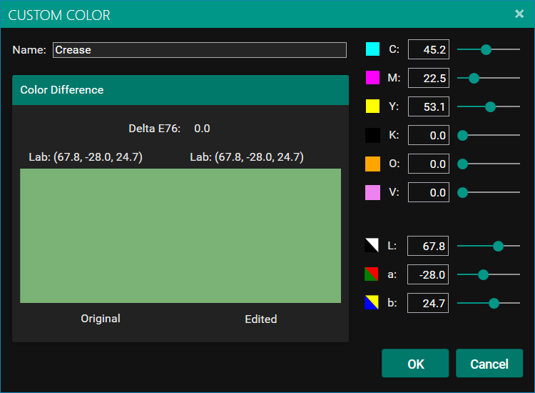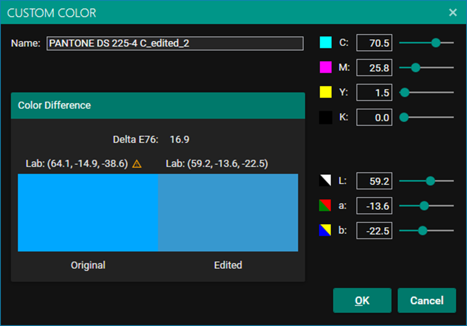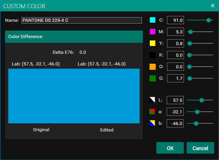 This will show the mapped in gamut color and the Delta E color difference. You can manually change the Lab value or the CMYK Sliders to change the colour. (Or CMYKOV sliders if you have a suitable ECG profile).