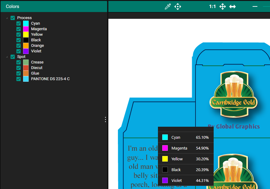 The Output Preview feature in the Job Editor provides a visual preview similar to Adobe Acrobat’s Output Preview. For N-channel ICC profiles like CMYKOV (6-color process), it treats the additional process colors (OV) as standard process colors while maintaining the behavior of spot colors unless manually converted. The rendering adjusts with different media and ICC profiles, and the Eyedropper tool will display color values accordingly, showing six colors for a 6-color ICC profile and four for a 4-color ICC profile. This ensures users can accurately see how different ICC profiles and media types affect their document, facilitating precise color management.