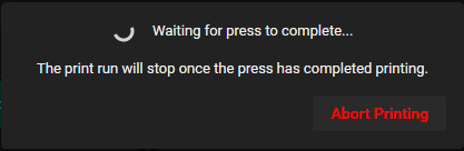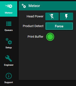 This dialog is to notify the user that the print run has not completed because a ProductDetect signal has not been sent to the Meteor Subsystem. - To send a Product Detect, and allow the print run to complete, change to the Meteor Pane and click the Product Detect 'Force' button.