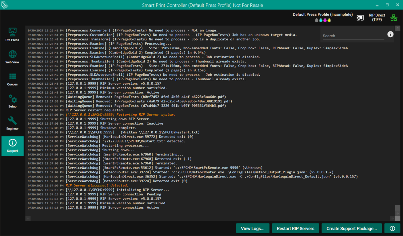 Select Restart RIP Servers to exit and restart the Harlequin Direct instance(s) and Smart PC Remotes for each RIP Server.