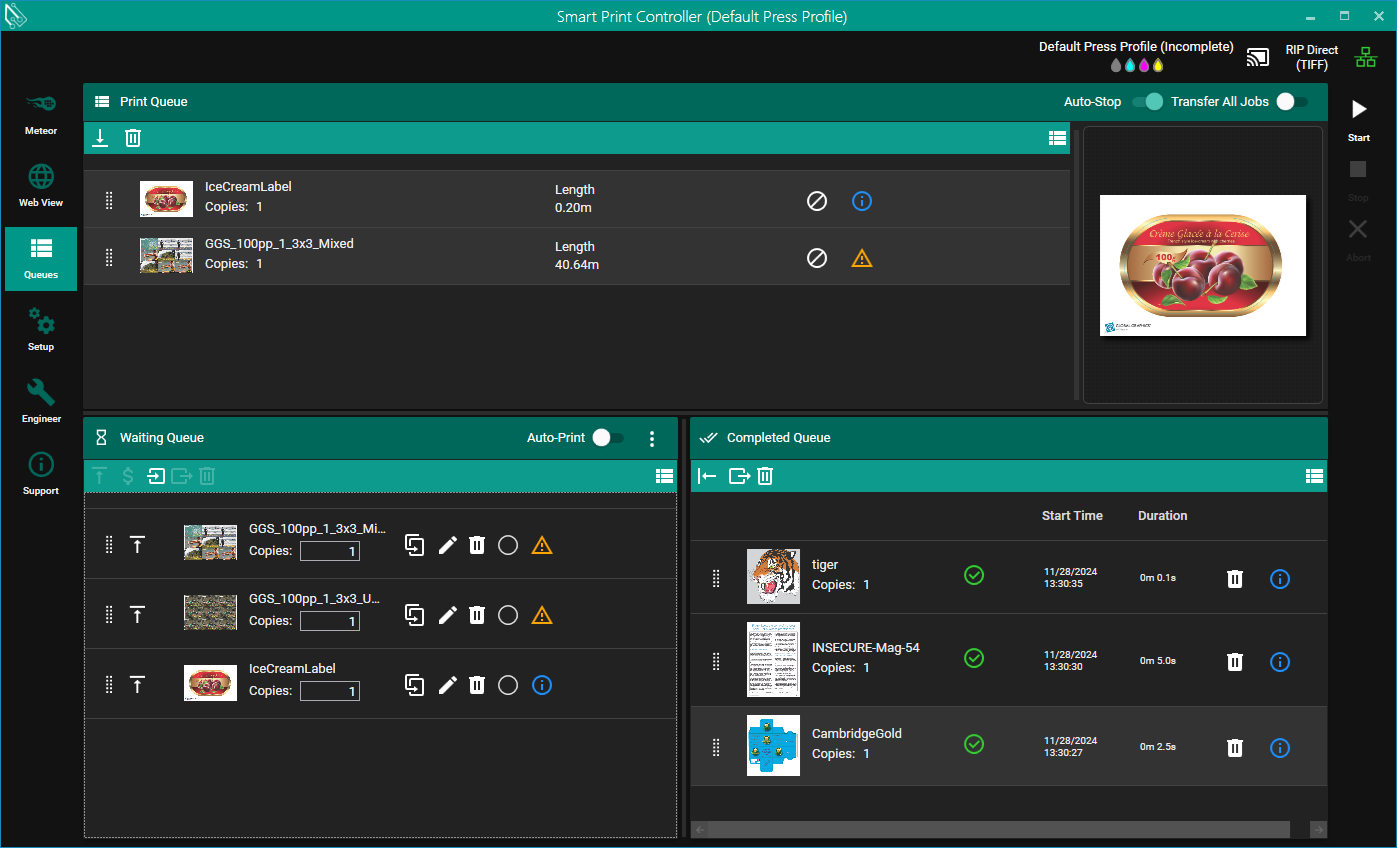 Smart Print Controller (SPC) is a press operator user interface that connects to one or more Harlequin Direct instances and manages the submission of jobs.