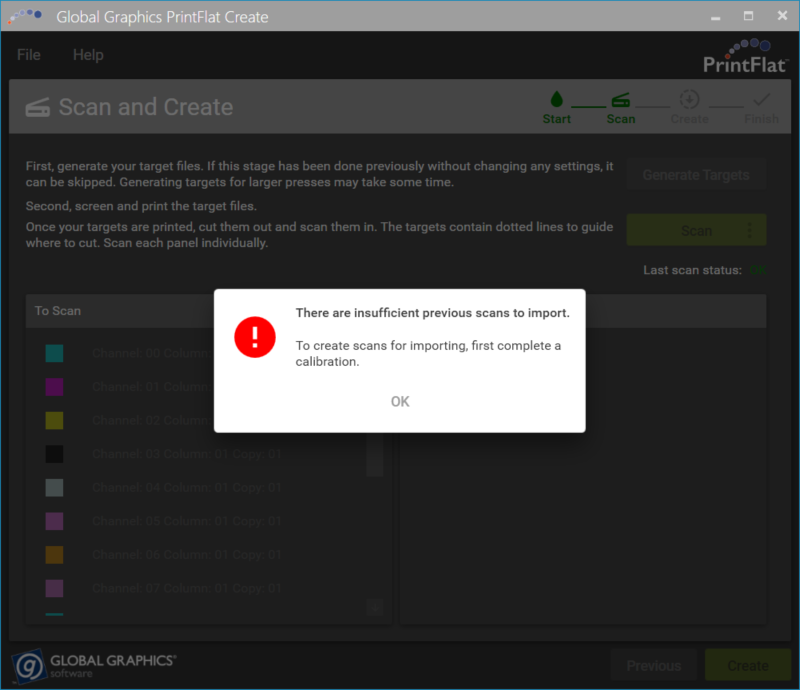 If you have previously completed a calibration, it is possible to reuse some (or all) of those existing scans, for instance when you have changed a print head and only wish to make new scans for the targets containing that print head. First, scan the new printed targets from the affected area, then click the menu on the "Scan" button and select "Import previous scans". The application will then import the remaining scans from the last calibration completed for that color channel. If the required scans are not available, then new scans of the additional printed targets must be made and the application will issue a warning: